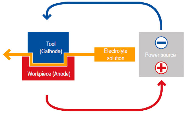 The basic principle of the ECM system is polarization of the workpiece (positive) and the tool (negative), a process generated by a direct current or pulse source. An electrolyte solution flows between the two, leading the metal ions dissolving from the workpiece